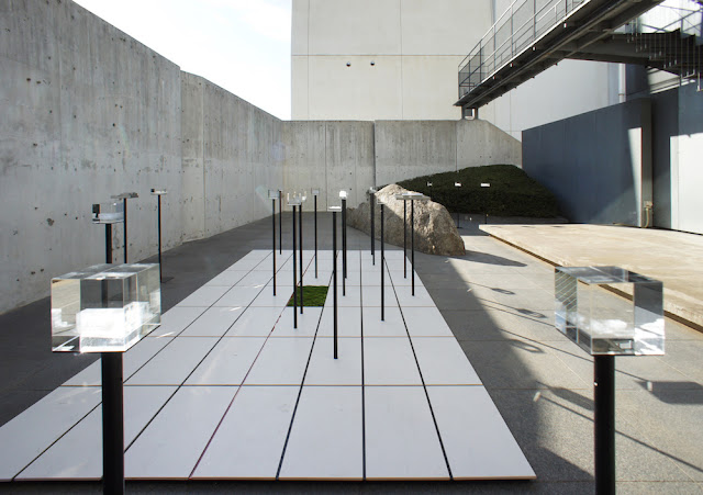 中央には京都御所を苔で表し、右奥の石を比叡山に見立て、その向こうに配置されたキューブは滋賀県の作品を表す、言わば枯山水になっている趣向だ。