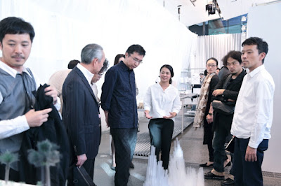 照明はパナソニックのテスト用のLEDスポットライト、カーテンとカーペットは丹青社、家具はUSM、テスト用の高照度のプロジェクターはキャノン。若手建築家の発表だけではなく各企業が開発中の製品も会場で試されている展示を計画された。